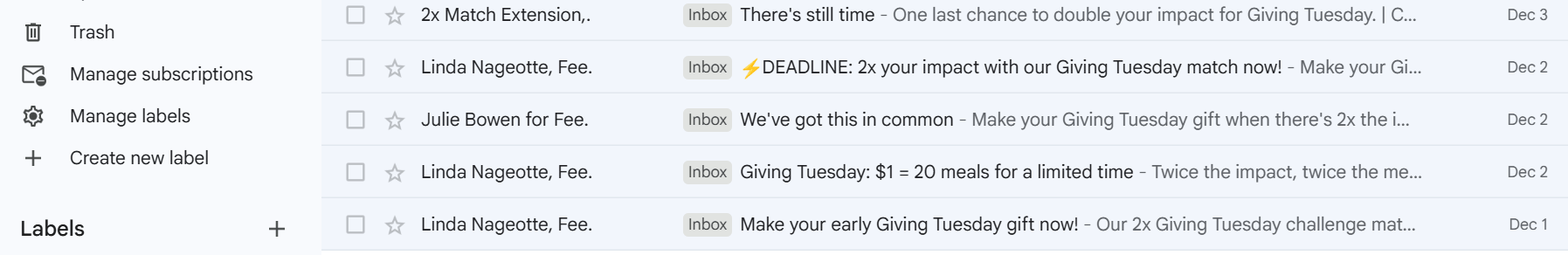 Look at the dates for the Giving Tuesday campaign below from Feeding America. They sent one initial email, and 4 follow-up emails. Notice that 3 of the follow-ups were sent in one day.